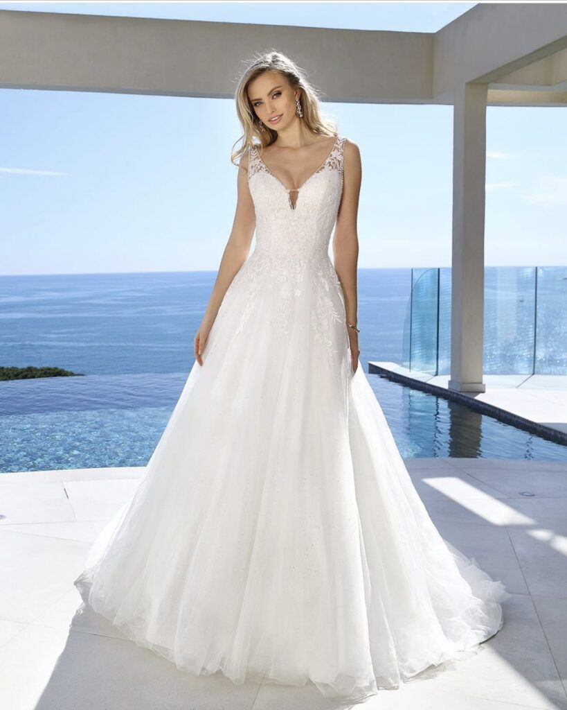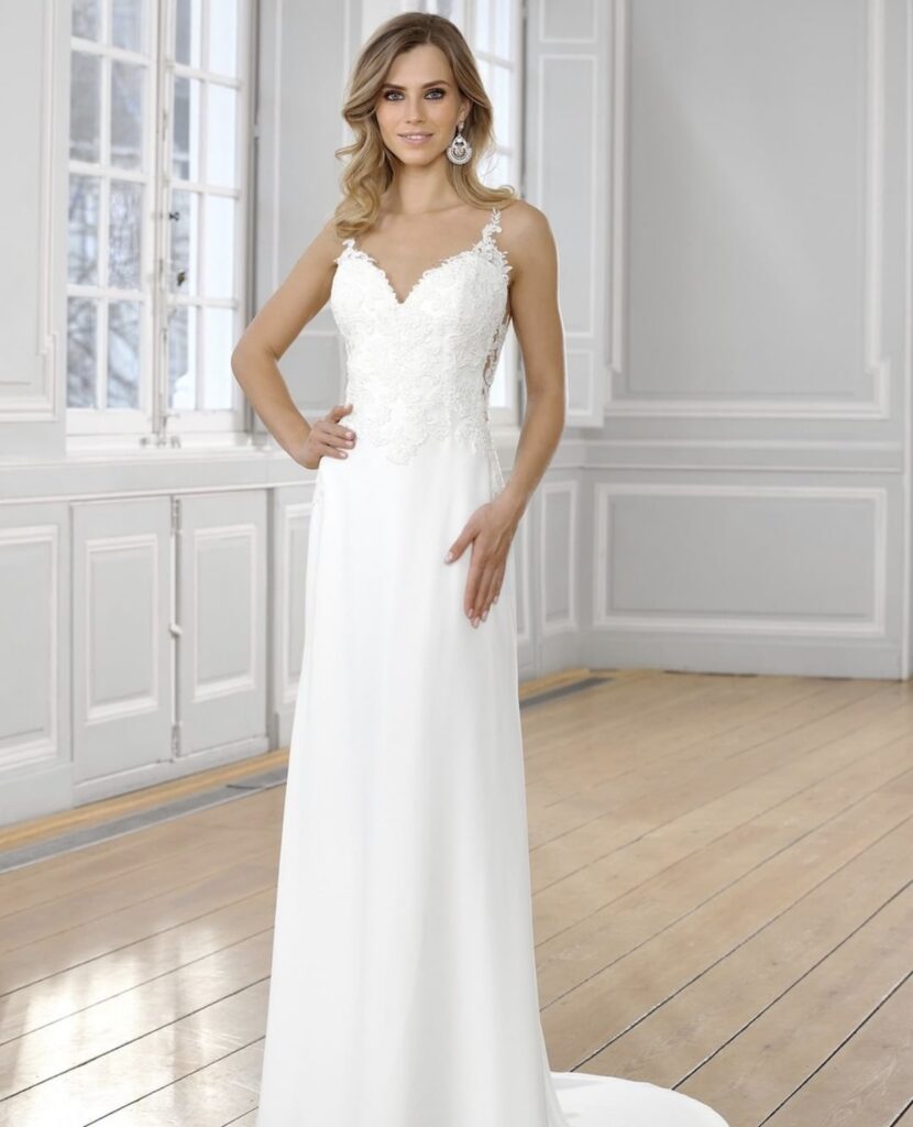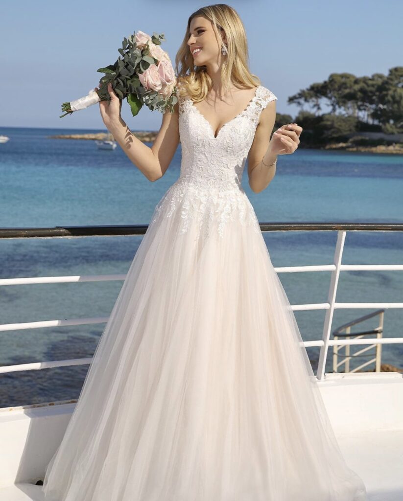 Die A- Linie bleibt einer der beliebtesten Stile für Hochzeitskleider, was wohl an den sehr vorteilhaften Merkmalen liegt: das schmal geschnittene Oberteil bringt jedes Dekolletee schön zur Geltung. Der ausgestellte Rock hingegen, kaschiert leicht die kleinen Problemzonen um Bauch, Beine oder Po. Zierlichen Bräuten zaubert sie leichte Kurven und den Curvybrides schenkt sie eine wunderschöne schmale Silhouette. Die A-Linie steht für ein zeitloses Design, der stilsichere und elegante Auftritt an deinem Hochzeitstag ist somit gesichert.